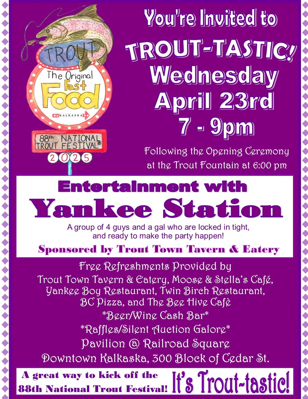 At 7 pm, following the Opening Ceremony, we will make our way to the Railroad Square Pavilion for Trout-tastic! featuring FREE appetizers and entertainment from Yankee Station, one of our region's finest party bands!
